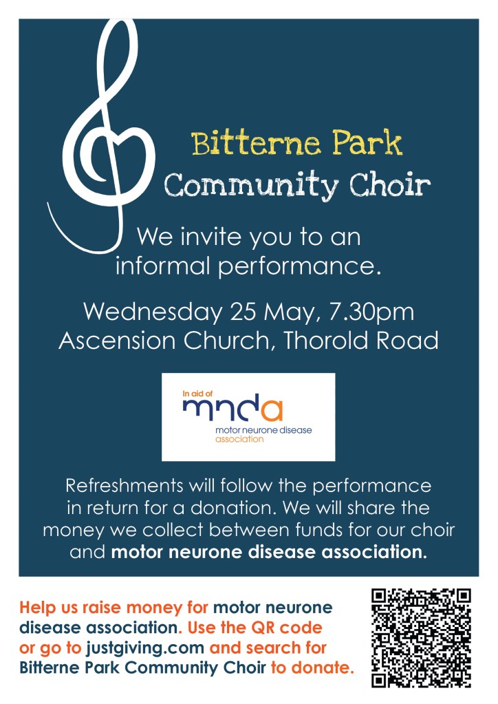 Refreshments will follow the performance in return for a donation. We will share the money collected between funds for our choir and the Motor Neuron Disease Association (MNDA). MNDA focuses on improving access to care, research and campaigning for those people living with, or affected by, motor neurone disease in England, Wales and Northern Ireland.